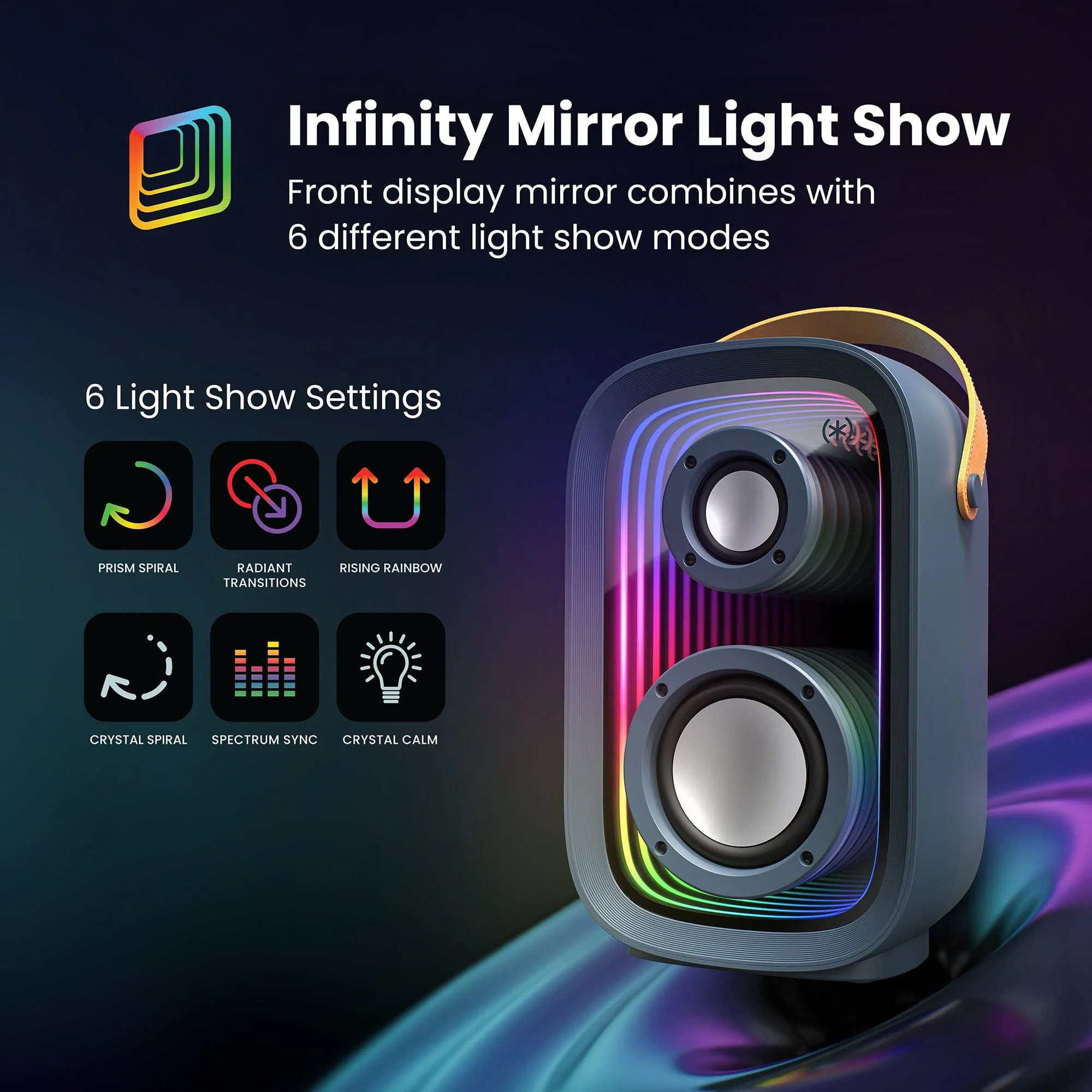 But the beauty doesn’t stop there. The Infinity Speaker boasts next-level tech to transform any experience. Take your parties to new heights with 6 customizable light shows that react to your music. The free Speck Gemtones App lets you personalize everything from light modes to volume levels and EQ profiles, ensuring your sound is perfectly tailored.